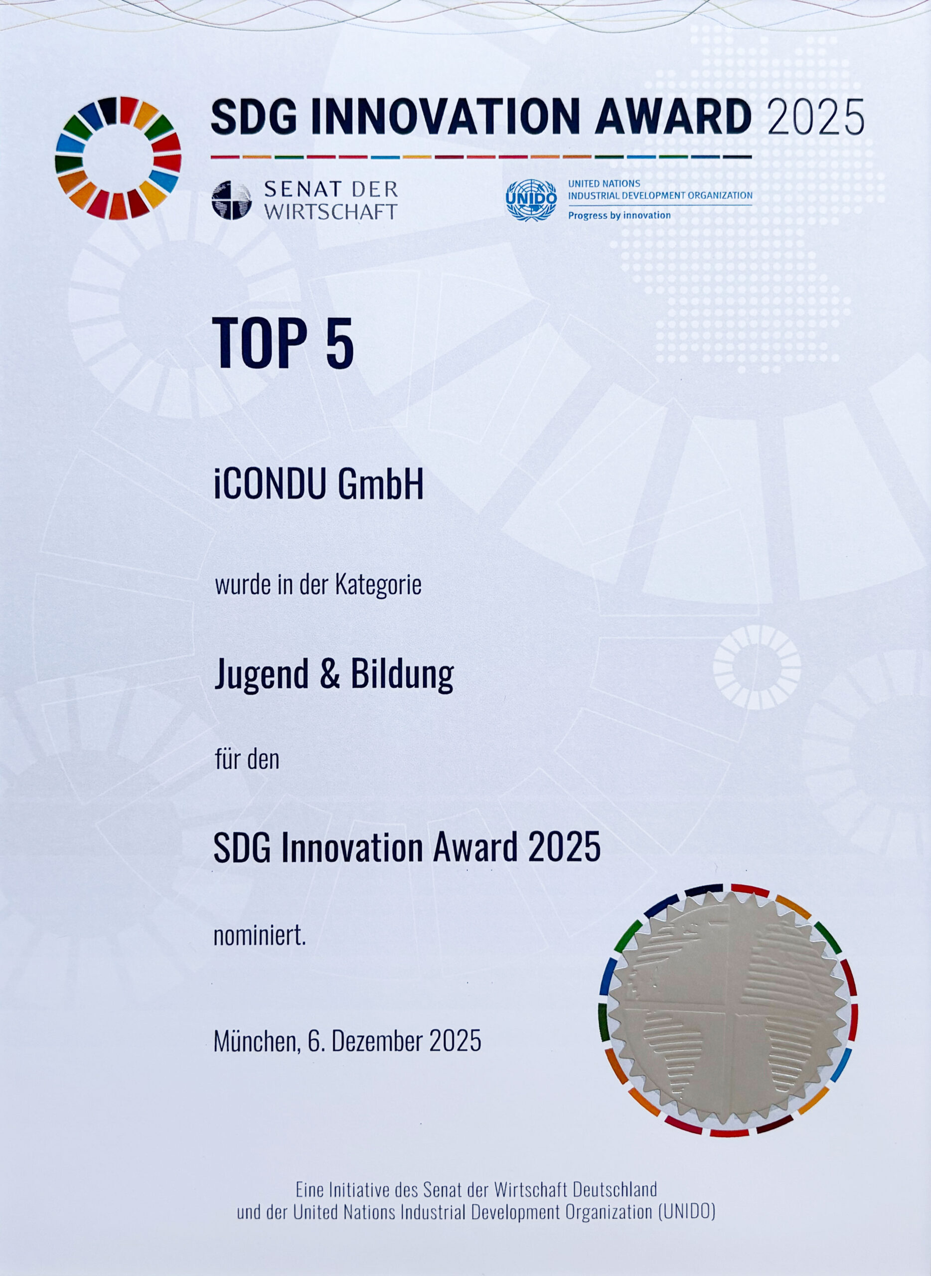 Mit dem SDG Innovation Award zeichnen der Senat der Wirtschaft Deutschland und die United Nations Industrial Development Organization (UNIDO) innovative Vorreiter und engagierte Pioniere aus, die einen vorbildlichen Beitrag zur Erreichung der globalen Nachhaltigkeitsziele (Sustainable Development Goals, SDGs) leisten.