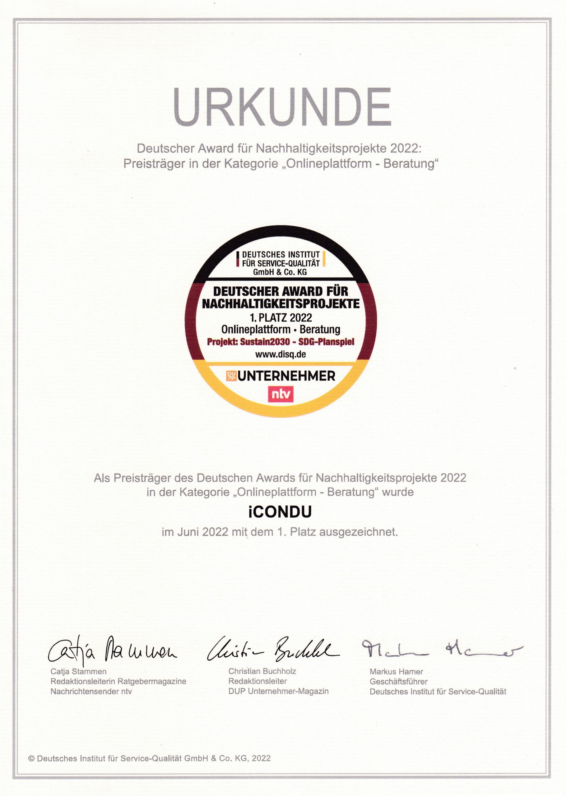 Im Juni 2022 wurde unser SDG-Planspiel Sustain2030® mit dem Deutschen Award für Nachhaltigkeitsprojekte 2022 des Deutschen Instituts für Service-Qualität ausgezeichnet. In der Kategroie „Online-Plattform • Beratung“ erzielte das Planspiel den 1. Platz. In der Jury-Bewertung heißt es: Die Jury begrüßt den Ansatz, der schwierige Wissensvermittlung in globaler Perspektive aufbereitet und das Thema SDG spielerisch angeht, um Wissen anschaulich zu vermitteln. Wo politische Meinungsbildung stattfindet wird Komplexität oft zur Falle, weil Problematiken in ihrer Wirkung nicht komplett zu beurteilen sind. Wünschenswert wäre das Tool auch in Verwaltungen, der Legislative etc., um Denkansätze zu verfeinern.
