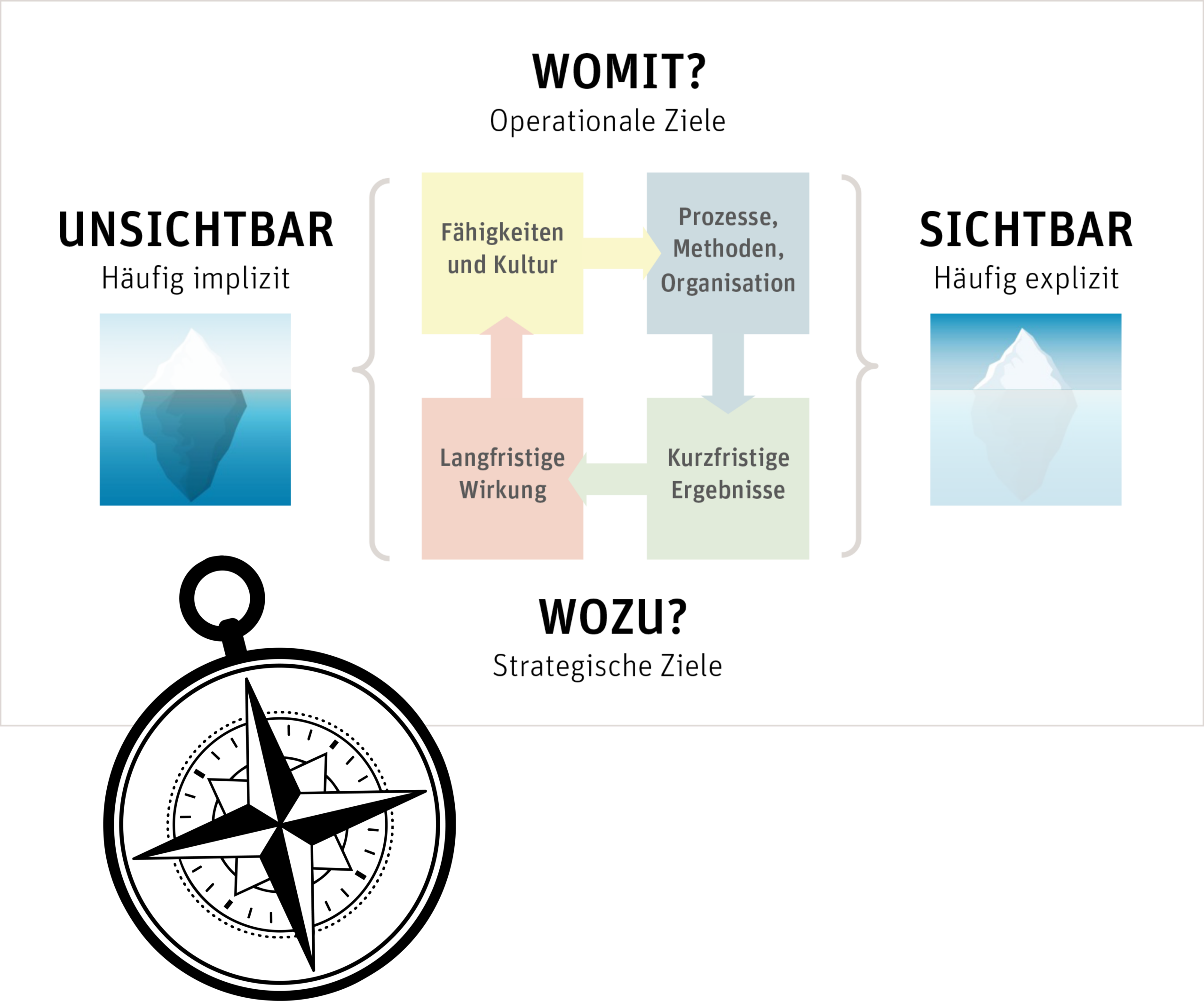 impactation® schließt die Lücke zwischen Strategie und Umsetzung, indem sowohl das WOZU als auch das WOMIT berücksichtigt wird. Das Ziel-Framework verbindet strategische mit operativen Zielen und lenkt den Blick dabei nicht nur auf explizite Vereinbarungen, sondern auch auf implizite Annahmen wie die erwartete Wirkung verschiedener Stakeholder und erforderliche Kompetenzen, Mindset und Leadership.